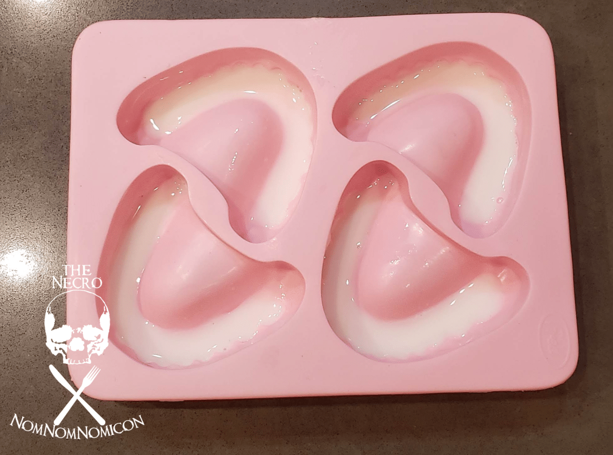 Once your white gelatin is set, gently spoon some room temperature gummy pink over the top of your teeth and use it to fill the entire mold (there is a chance your pink gummy gelatin has set by now, which is why we have it in a microwave-safe bowl. Gently zap for about 15 seconds and then allow to recool to room temp before adding it to your white layer. Adding it while it’s too hot will melt the white layer and you’ll just end up with a swirly pink and white mess.)